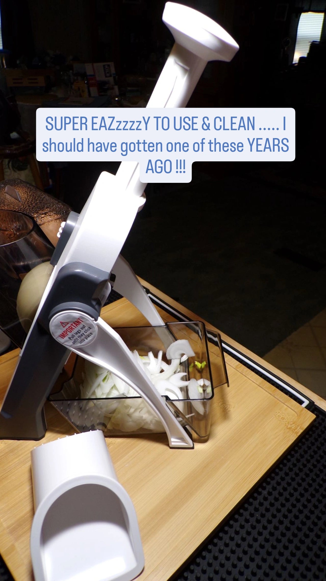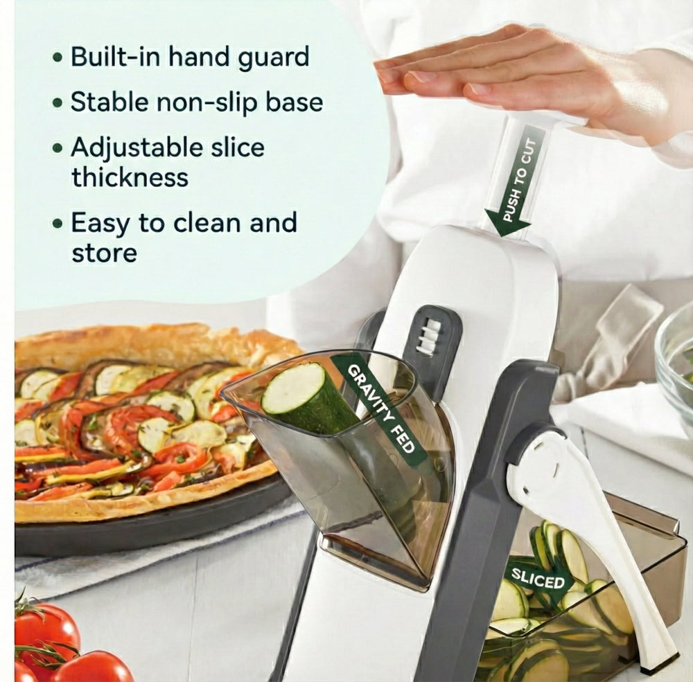 Collects sliced ingredients neatly below the blade, helping keep your workspace organized and mess-free.